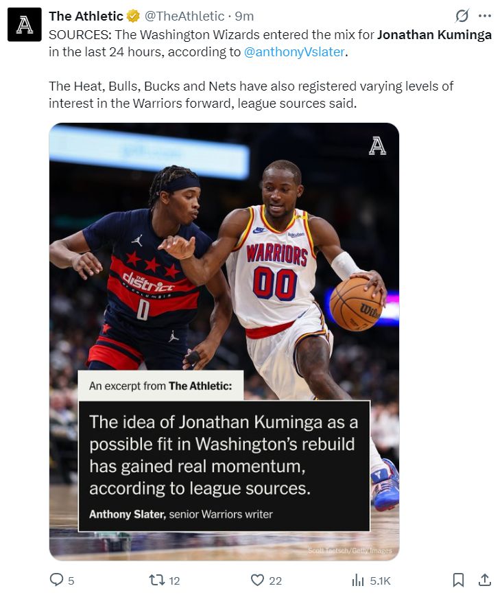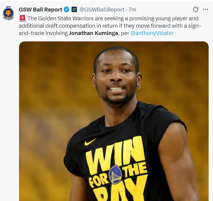 根据安东尼-斯莱德的报道,勇士队对库明加的要价是一位有潜力的球员与一个未来首轮签,前提是他们愿意先签后换得到库明加。