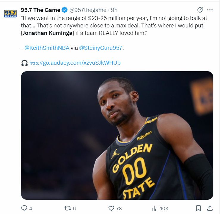 而根据肯尼-史密斯的说法,勇士队认为库明加的价值在均薪2300-2500万之间,如果有球队愿意给他这个额度的合同然后给勇士合适的筹码勇士会毫不犹豫送走他。