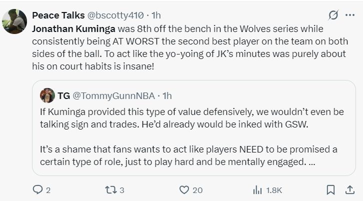 还有其他球队的球迷认为勇士的要价过高,他们觉得库明加被科尔轻视不是没有道理,他在对阵森林狼时攻防两端都很拉胯,库明加这种特殊球员需要很多支持才可以成为核心。