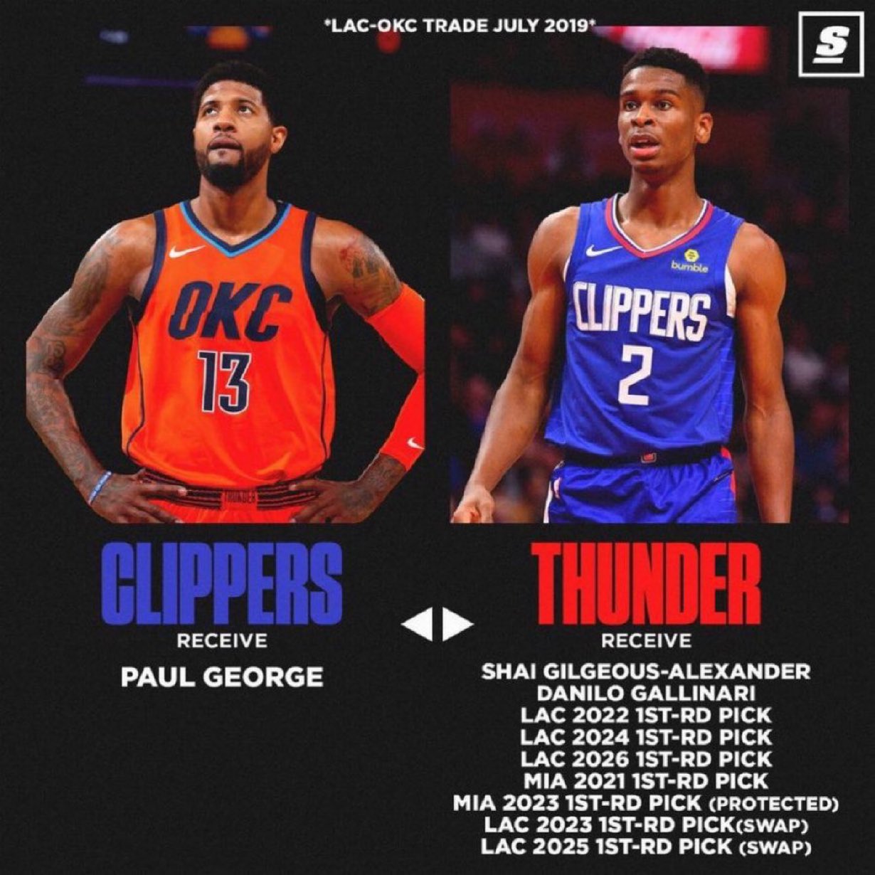 值得一提的是,2019年快船送出亚历山大+加里纳利+4个无保护首轮签+1个受保护首轮签+2个首轮互换,9换1交易得到乔治。